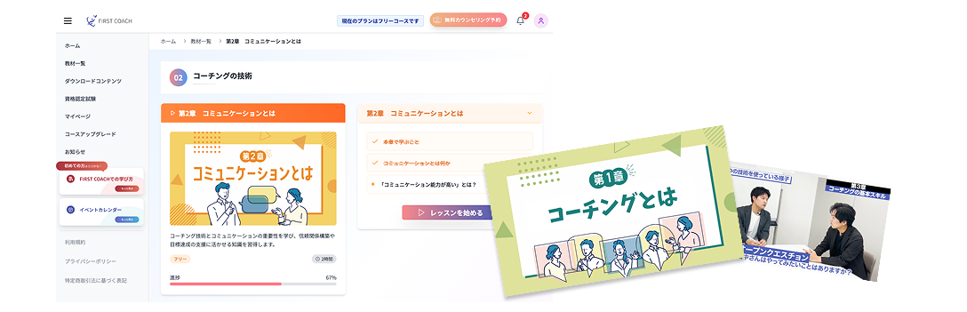 まずは動画とテキスト教材で知識をインプット。次に、プロコーチとのマンツーマンレッスンで実践し、
