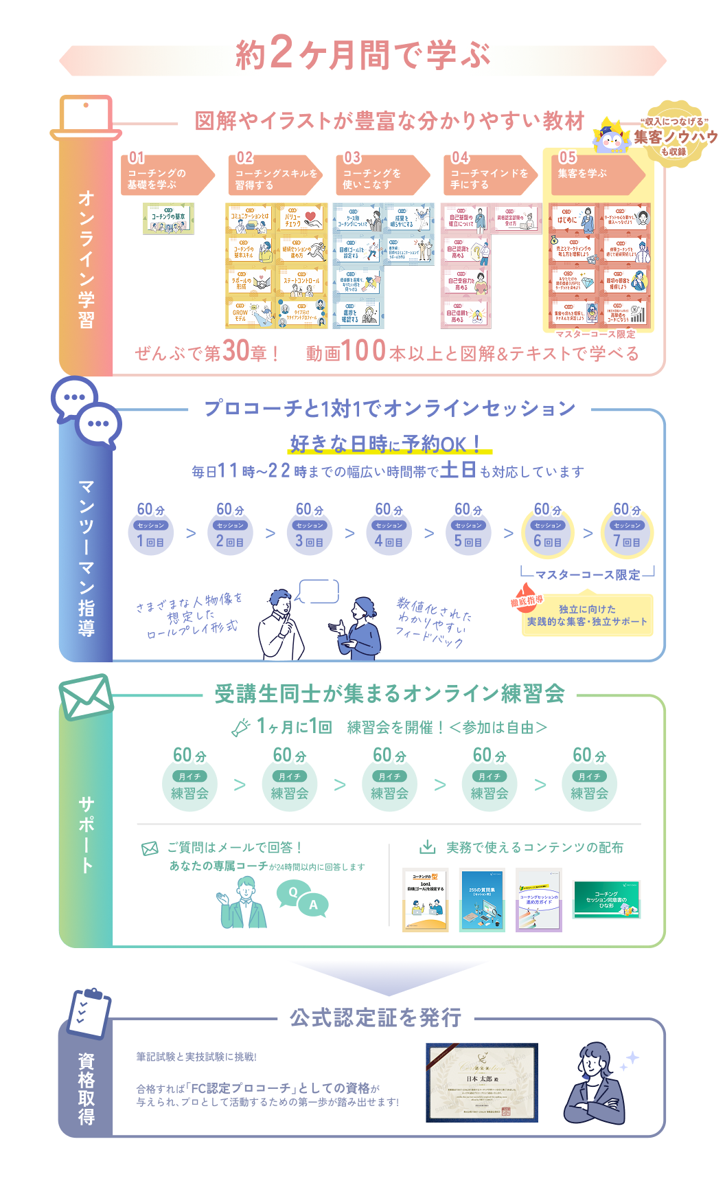 毎回のセッションには、あなた専属のプロコーチがつき、一貫して伴走します。 現場で使える力を実践形式で徹底的に習得していきます。
