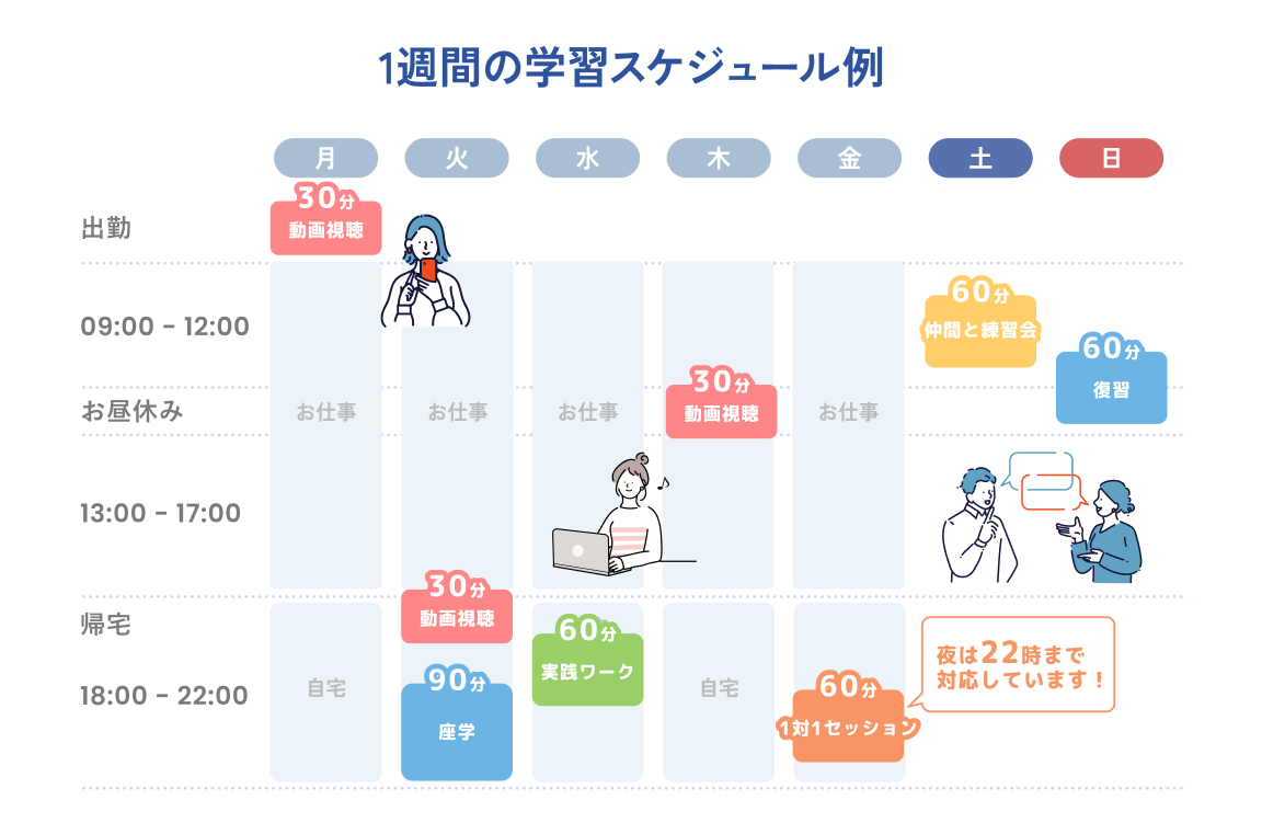 メールサポートや仲間との練習会、コーチとの1on1セッションなど、オンラインならではの多彩な学習方法で安心して学べます。